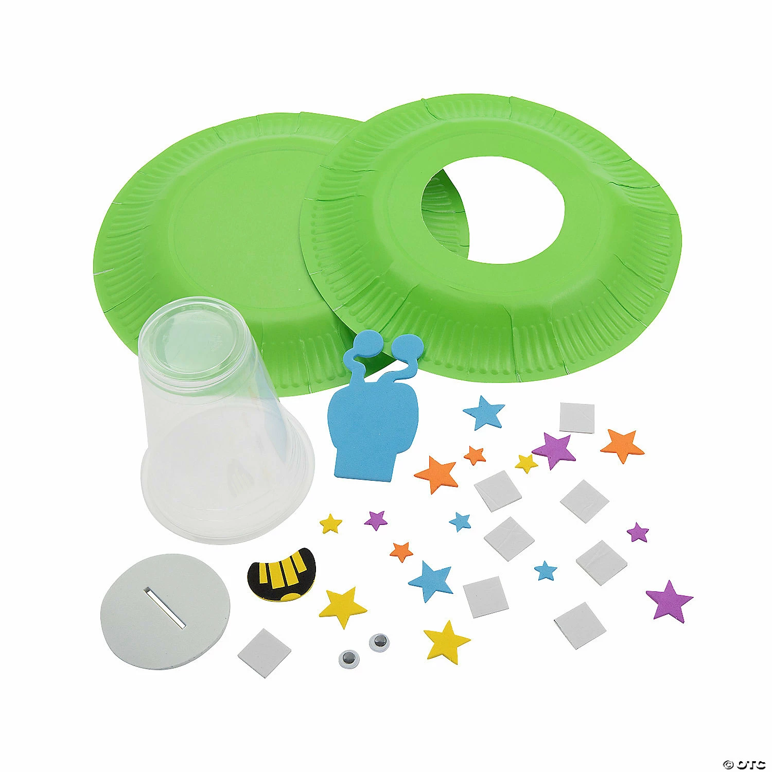 Do you have kids who are ready for a craft kit that is out of this world? This cute and silly alien craft kit creates a goofy alien in a colorful UFO using disposable cups and paper plates. Disposable tableware has never been so silly! A great craft for a space-themed birthday party activity or a classroom craft, this is one of the most fun crafts in the galaxy! Includes self-adhesive foam pieces, 16-oz. plastic cups and googly eyes. 9″ x 4 1/2″ Makes 12. All craft kit pieces are pre-packaged for individual use. Kits include instructions. © OTC3D Alien UFO Paper Plate Tabletop Craft Kit Instructions