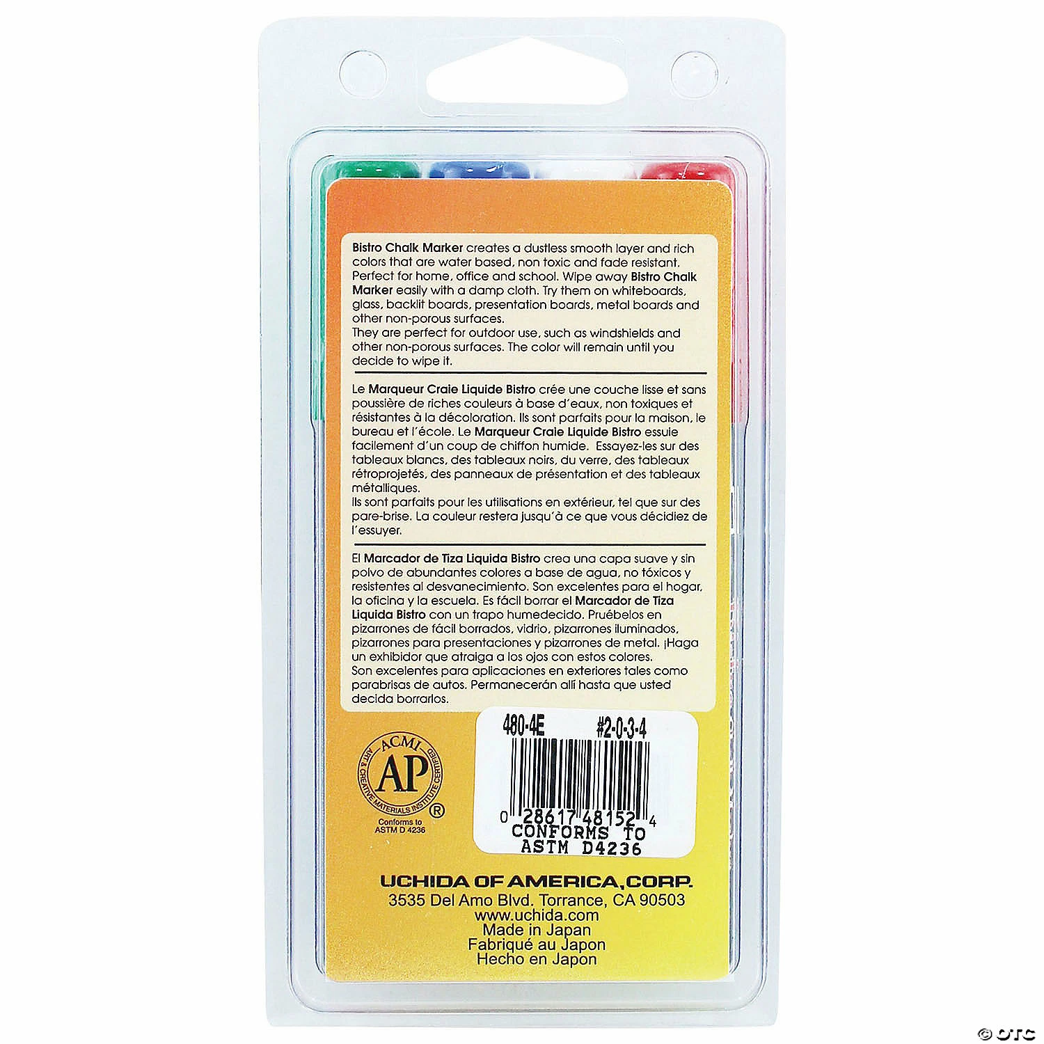 Use Bistro Chalk Markers on chalkboards, light boards, windows and windshields. A wonderful way to create chalkboard art to attract attention and increase sales. They are opaque, water based, pigmented, erasable with a damp cloth. The markers are all made in Japan from the highest quality Japanese ingredients with customer satisfaction as the prime goal. These state of the art markers are also light-fast, meaning they do not deteriorate when exposed to sunlight and they retain the most vibrant colors compared to all other chalk markers in the market! Sold as a set of 2 packs, 8 markers total. Special Shipping Information: This item ships separately from other items in your order. This item cannot ship to a P.O. Box. This item may be subject to additional processing days. ITEM IS NOT ELIGIBLE FOR EXPEDITED SHIPPING You may initiate a return for unused items within 30 days, if the items are in original packaging with all original materials included with the shipment.