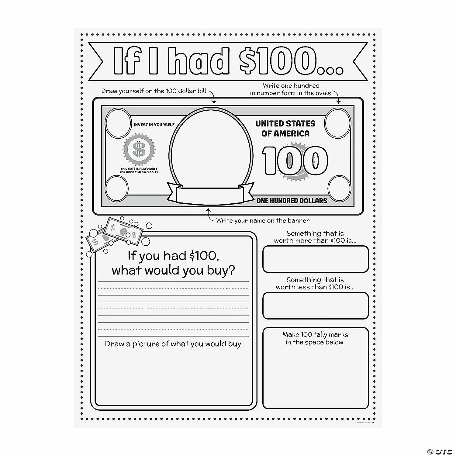 There’s one hundred ways to spend a one-hundred-dollar bill in one day! These posters encourage kids to use their imagination and creativity while completing drawing and coloring tasks as well as writing prompts like “If you had $100, what would you buy?” Once complete, incorporate the posters into your educational lessons and hang them up around the classroom. It’s also a great way to celebrate the 100th day of school! Paper. (30 pcs. per unit) 16″ x 20 3/4″ © OTC