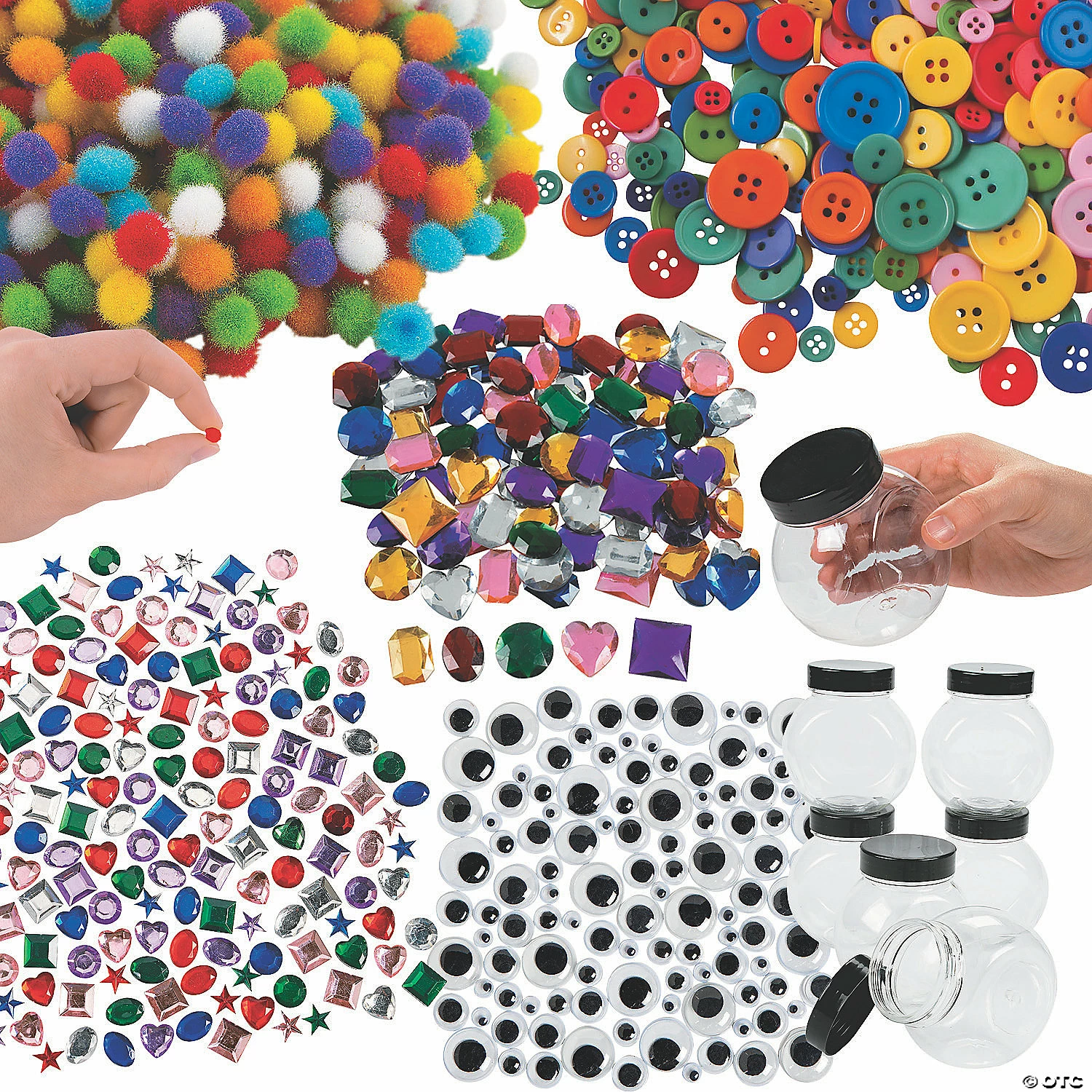 Crafters rejoice! Refresh your craft supplies at home or in the classroom with this impressive assortment of craft supplies and storage jars in which to store the supplies. Stay organized with crafting supplies and make post-crafting cleanup easier with storage containers with lids. The perfect addition to crafting supplies, this kit will spurn creativity. (2406 pcs. per unit) Assortment may vary.Includes:• 500 Acrylic Self-Adhesive Jewel Assortment (1/2″)• 100 Acylic Jumbo Self-Adhesive Jewels (1″)• 800 Plastic Bright Rainbow Craft Buttons (1/4″ – 1″)• 500 Acrylic Itty Bitty Pom-Poms (1/4″)• 500 Plastic Black Googly Eyes (6mm-13mm)• 6 Plastic Round Storage Jars with Lids (Upright, 3 1/4″ x 3″ with a 2″ diameter opening at top.)