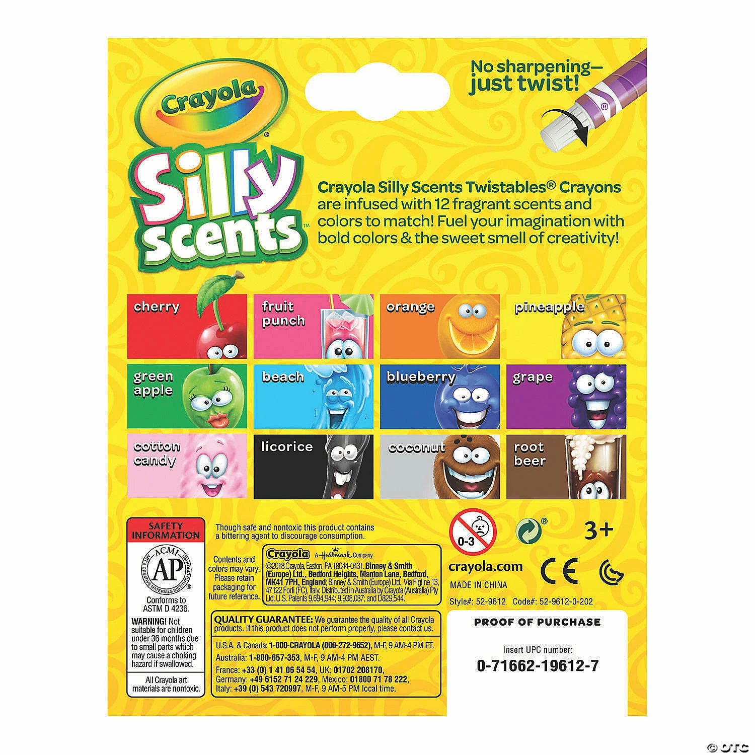 Crayola Silly Scents combines fragrant scents in a cool, colorful line of crayons, markers and colored pencils! Each aromatic art tool comes ready to scribble and sniff. Each 12 pack of Mini Twistables Crayons includes Cherry, Orange, Pineapple, Apple, Beach, Blueberry, Grape, Tropical Punch, Cotton Candy, Licorice, Coconut, Root Beer. Twistables never need sharpening โ just twist to advance crayon. Comes in a delightful character pack. Sold as 6 packs for a total of 72 crayons. Special Shipping Information: This item ships separately from other items in your order. This item cannot ship to a P.O. Box. This item may be subject to additional processing days. ITEM IS NOT ELIGIBLE FOR EXPEDITED SHIPPING