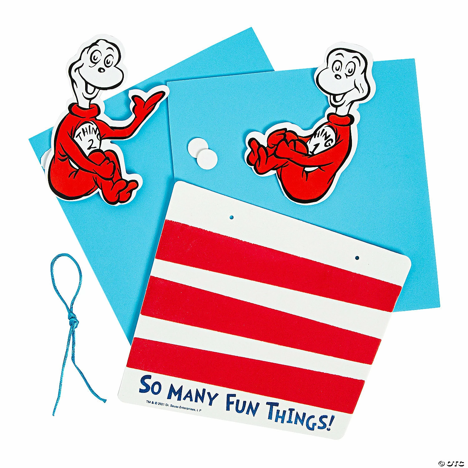 There are so many fun things to do to document childhood, but we’ve got to give a hand to this one! Little ones are sure to giggle as they put together this unique handprint craft kit and see their handprints disguised as Dr. Seuss’ Thing 1 & Thing 2. Makes a great classroom activity or at-home craft! Trace each child’s hand on the foam and cut out the shapes. All other pieces are pre-cut. Includes self-adhesive foam pieces and satin cord for hanging. 6 3/4″ x 6 1/4″ Makes 12. All craft kit pieces are pre-packaged for individual use. Kits include instructions. © OTC / TM & © 2020 Dr. Seuss Enterprises, L.P. All Rights Reserved.