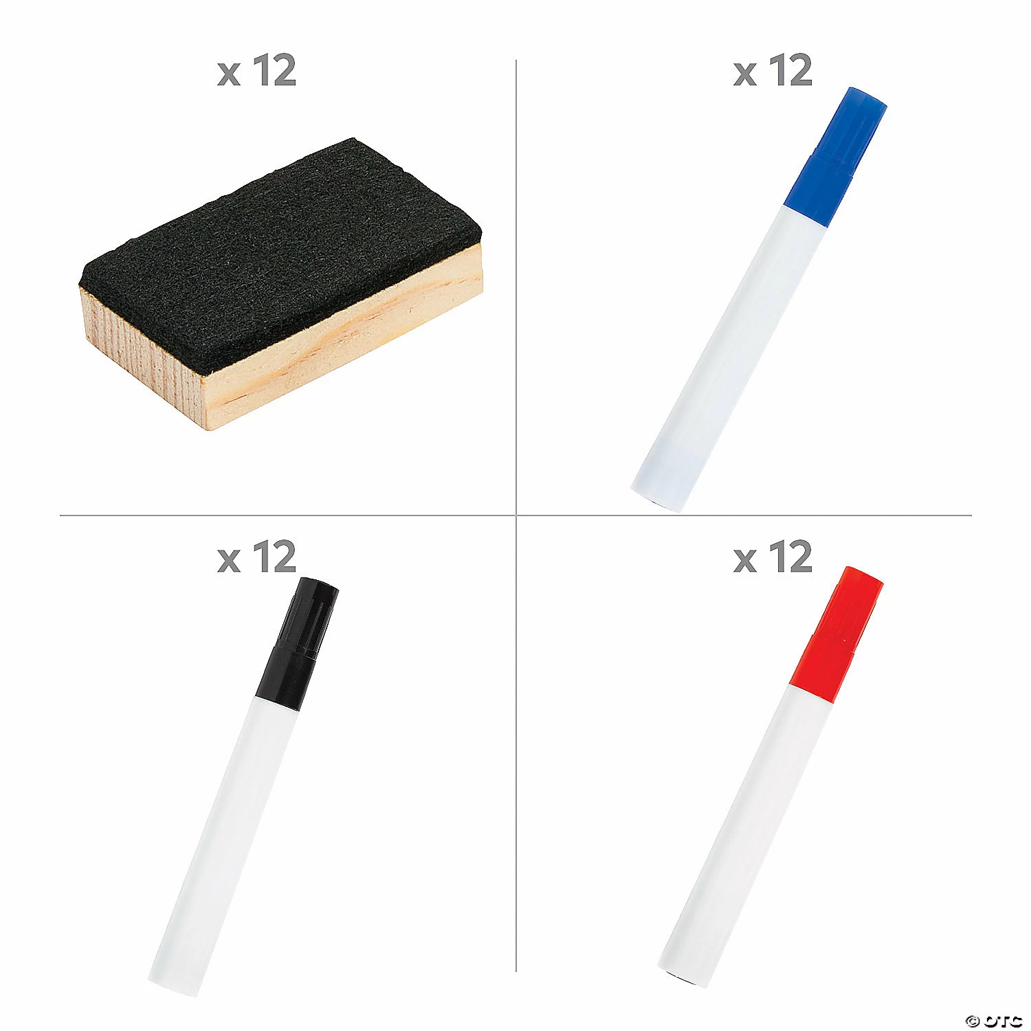Stock up on dry erase classroom essentials! This assortment of dry erase markers and erasers will keep you set up for months…if not the whole school year. Keep these school supplies stashed away for your own use or set them out for students to take advantage of. Either way, this value kit is a great addition to your teaching aids! (48 pcs. per unit)Includes:• 12 Plastic Black Dry Erase Markers Teacher Pack (5 1/2″ Safe and non-toxic. Conforms to ASTM D-4236.)• 12 Plastic Blue Dry Erase Markers Teacher Pack (5 1/2″ Safe and non-toxic. Conforms to ASTM D-4236.)• 12 Wood Mini Dry Erase Erasers (2 1/2″ x 5/8″ x 9/16″)• 12 Plastic Red Dry Erase Markers Teacher Pack (5 1/2″ Safe and non-toxic. Conforms to ASTM D-4236.)• Assortments are subject to change at any time and may vary from picture shown. Substituted items will be similar in nature.