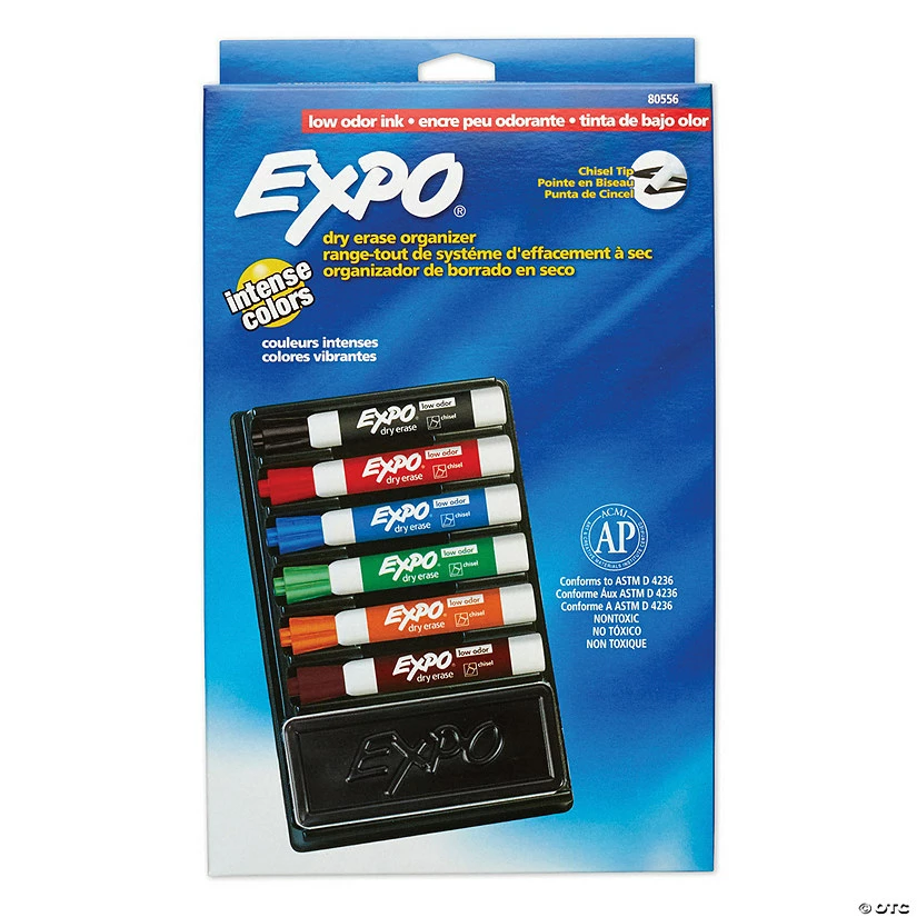 The EXPO® Dry Erase Organizer includes 6 EXPO® Low Odor Dry Erase Markers with chisel tips, an EXPO® Eraser and a mount that attaches to most smooth surfaces with the enclosed adhesive strip. EXPO® Low Odor Dry Erase Markers use a specially formulated, alcohol-based ink with virtually no odor. The markers feature vivid ink that is quick-drying and easy to see from a distance. These dry erase markers write on whiteboards, glass and most non-porous surfaces. The EXPO® Block Eraser helps remove dry erase markings quickly and easily from whiteboards, glass and most non-porous surfaces. The soft pile eraser can be easily cleaned with soap and water. Eraser measures 5.125″ x 1.5″ and can be cleaned with soap and water.Features:• Stores 6 dry erase markers and an eraser• Durable organizer mounts to most smooth surfaces with enclosed adhesive strips• Ideal for classrooms, offices and home• Includes mountable organizer, 6 chisel tip low odor markers, and eraser Special Shipping Information: This item ships separately from other items in your order. This item cannot ship to a P.O. Box. This item may be subject to additional processing days. ITEM IS NOT ELIGIBLE FOR EXPEDITED SHIPPING You may initiate a return for unused items within 30 days, if the items are in original packaging with all original materials included with the shipment.