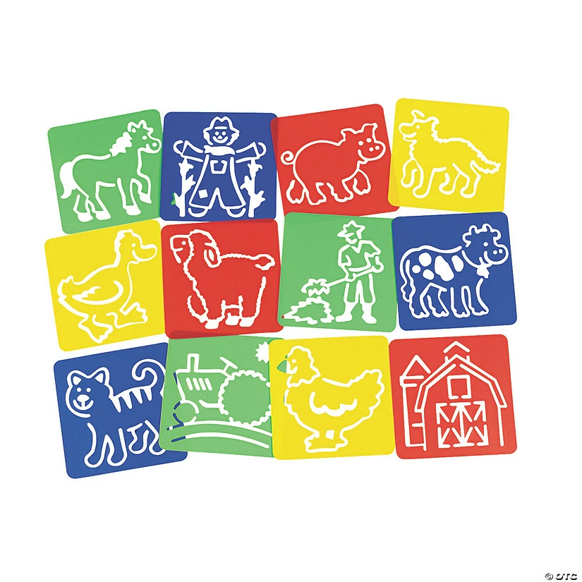 12 Fun On The Farm! Stencils. Create a fun farm scene with our easy-to-use stencils. Our assortment of plastic stencils includes a cow, horse, duck, pig, tractor, barn and more! A fun arts & crafts project idea for home or school. 5″ square. © OTC