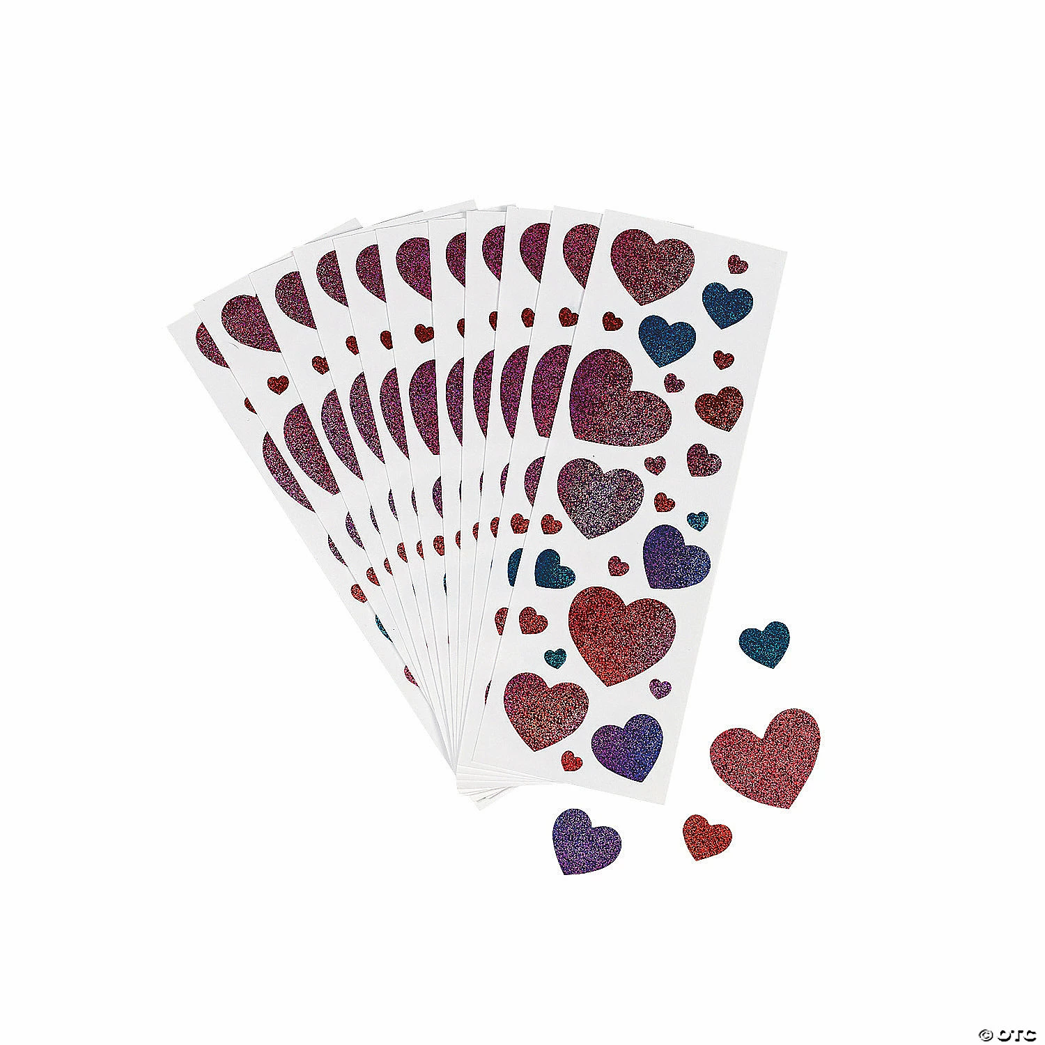 Glitter Heart Stickers. Use these heart-shaped stickers to add some sparkle to your notes and greeting cards! In a variety of sizes and colors, these dazzling stickers are perfect for any Valentine’s Day craft project. You can also tuck these shimmering stickers in party goody bags at a February 14th celebration. (25 stickers per sheet, 1 dozen sheets per unit) 1/4″ – 1 1/4″ © OTC