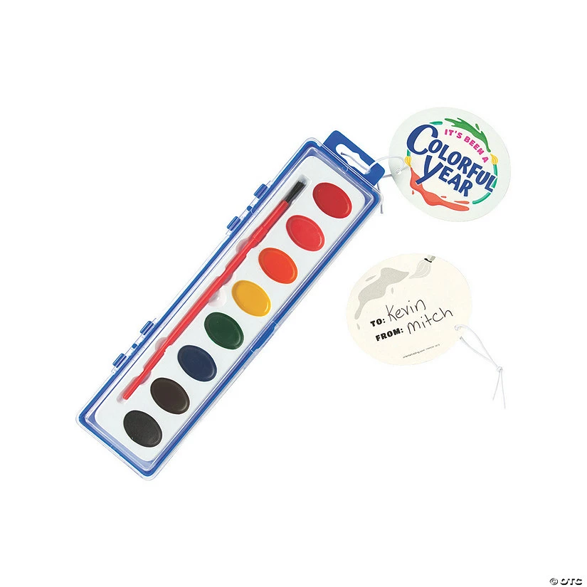 Celebrate the conclusion of another colorful school year with these fun giveaways. Perfect as gifts from teacher to students, these also work well as gifts from student to student. The classroom will be buzzing with creativity when these watercolor paint trays are handed out – and luckily, the paints are washable! Safe and non-toxic. Includes To/From space on a 2 3/4″ x 2 1/2″ cardstock card. (1 dozen per unit) 8-color watercolor paint tray, 8 1/4″ x 2 1/4″. Conforms to ASTM-4236. Simple assembly required. © OTC