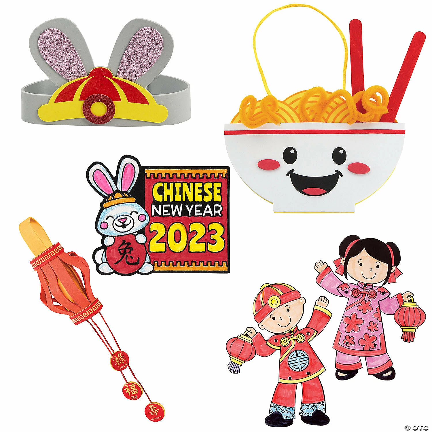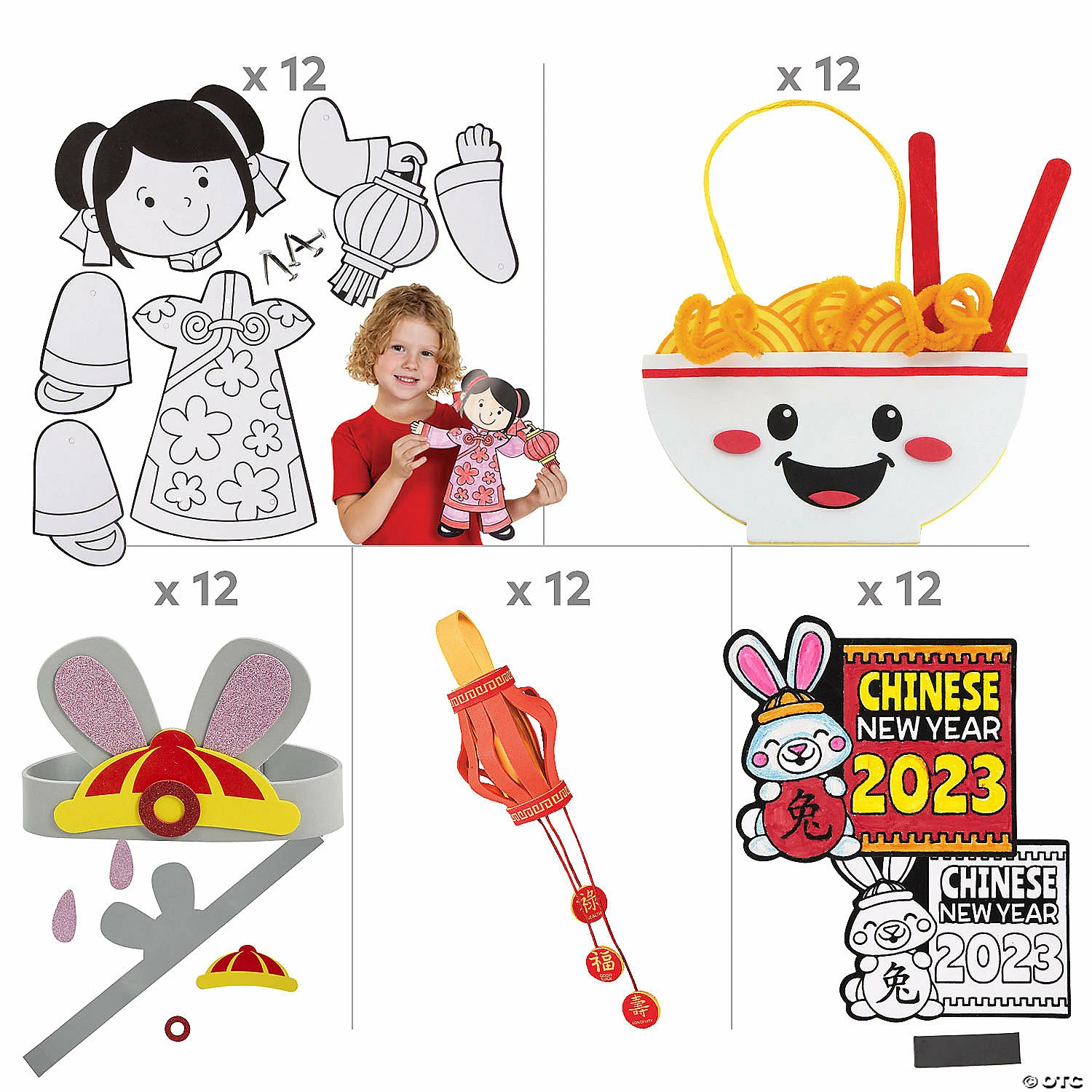 If you’re looking for a fun way to celebrate Lunar New Year, this craft assortment for kids is the perfect buy! With a variety of coloring activities and craft kits, this set is great for at-home activities, daycares, classrooms and more. (60 projects per unit) Assortment may vary. All craft kit pieces are pre-packaged for individual use. Kits include instructions.Includes:โข 12 Cardstock Color Your Own 2023 Chinese New Year of the Rabbit Fuzzy Magnets (4″ x 3 1/4″)โข 12 Foam Lunar New Year of the Rabbit Crown Craft Kits (Includes self-adhesive foam pieces and tab and notch closure for adjustable fit. 22 1/2″ x 5 1/4″)โข 12 Cardstock Color Your Own Lunar New Year Joined Cutouts (Includes metal brads. 10 1/4″ x 12″)โข 12 Chinese Noodle Bowl Craft Kits (Includes self-adhesive foam pieces, wooden craft sticks, chenille stems and satin cording. 5″ x 5 3/4″)โข 12 Cardstock Magic Color Scratch Lunar New Year Lanterns (Includes self-adhesive foam shapes and satin cord for hanging. 3″ x 5 1/2″)
