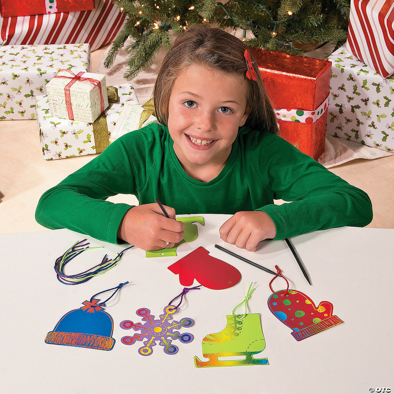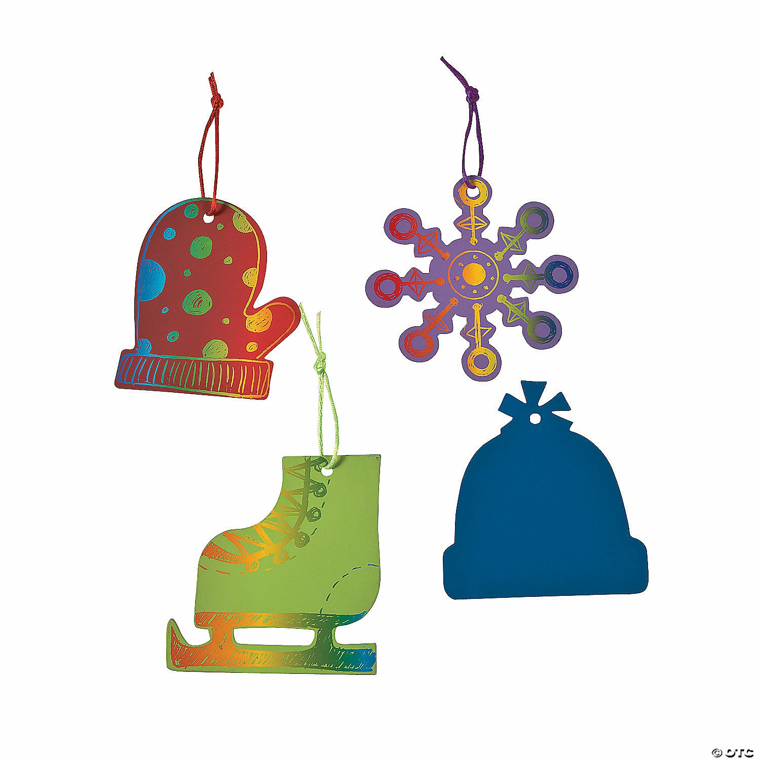 Magic Color Scratch Winter Christmas Ornaments. Create your own message or design on these winter shapes! Includes snowflakes, hats, mittens and ice skate shapes. (24 paper shapes, 12 scratching tools and 24 satin ribbons per unit) 4″ – 4 1/4″ © OTC