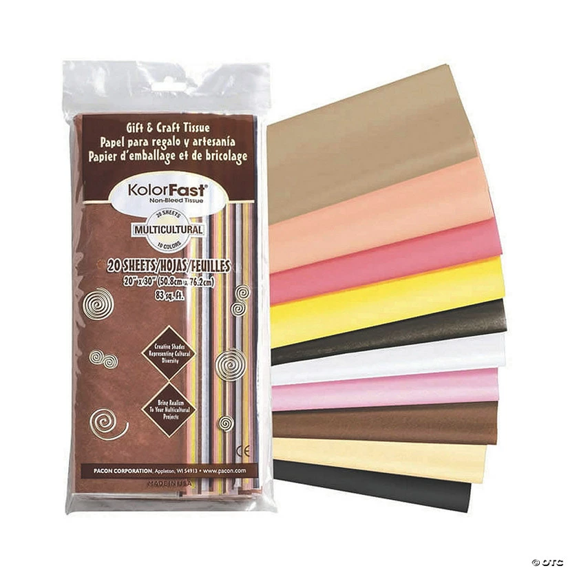 KolorFast® Tissue Paper stays bold and true without bleeding, making it ideal for wrapping gifts or for creating crisp, clean artwork. Strong sheets can be cut, folded, glued and crinkled without tearing. This tissue assortment helps “people-making” projects become more realistic. Two sheets each of 10 multi-cultural colors. Sheets measure 20″ x 30″. Each pack includes 20 sheets. Sold as 6 packs, total of 120 sheets. Special Shipping Information: This item ships separately from other items in your order. This item cannot ship to a P.O. Box. This item may be subject to additional processing days. ITEM IS NOT ELIGIBLE FOR EXPEDITED SHIPPING