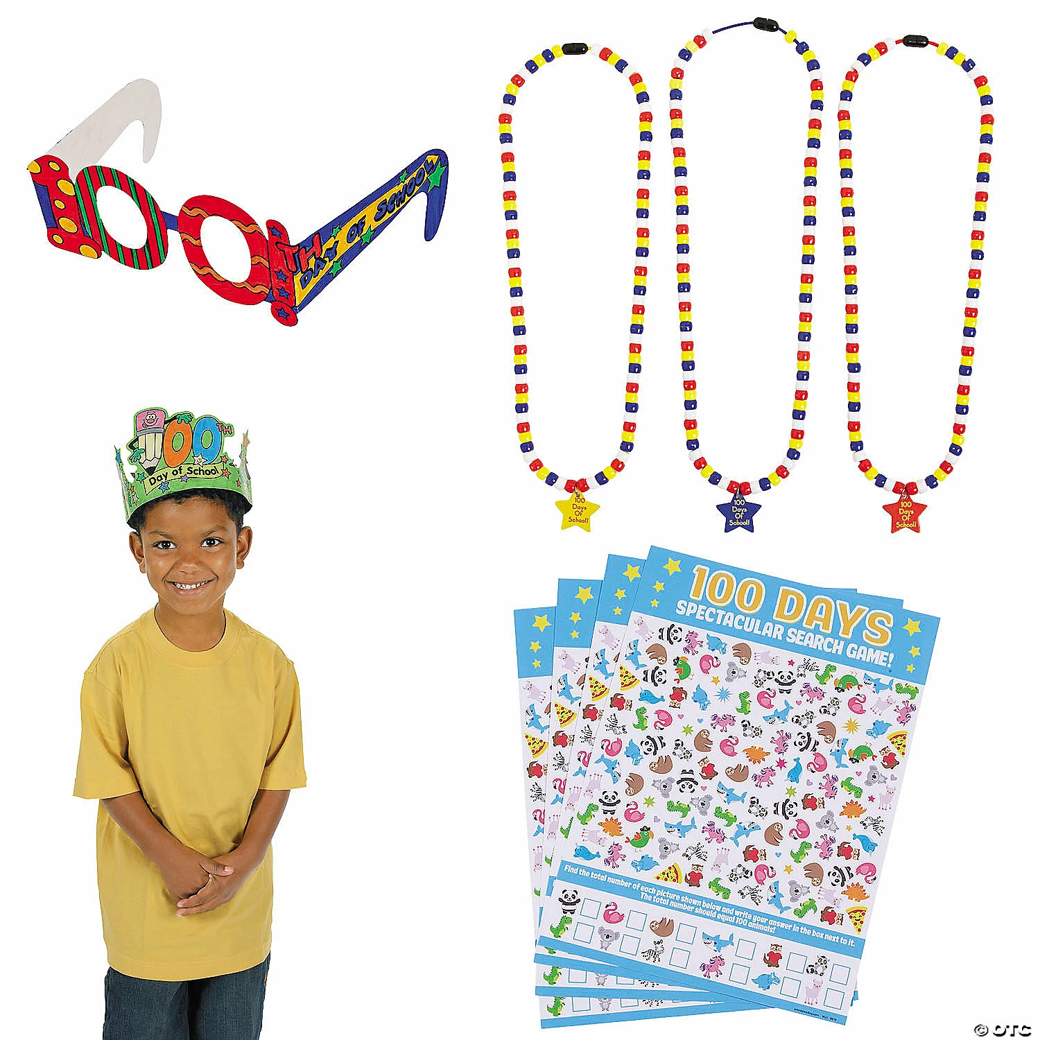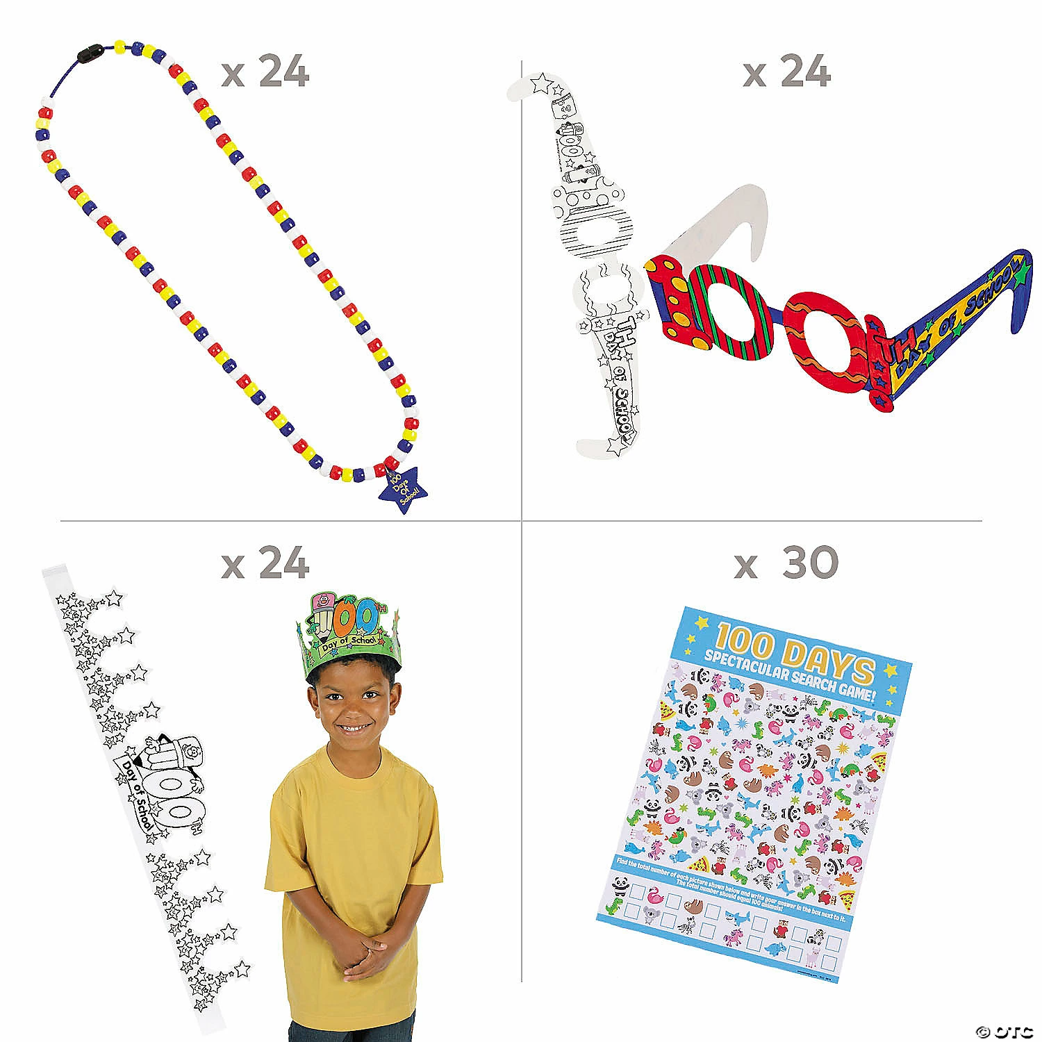 Make sure any celebration of the 100th Day of School is fun and rewarding with the help of this 100th day of school activity and favor set. Featuring a variety of arts and crafts as well as school supplies, kids can reflect on how much they’ve learned the past 100 days! (66 pcs. per unit) Simple assembly required. Assortment may vary. All craft kit pieces are pre-packaged for individual use. Kits include instructions.Includes:• 12 Cardstock Color Your Own 100th Day of School Crowns (Includes a tab and notch closure. 24″ x 5″)• 12 Beaded 100 Days of School Necklace Craft Kits (Each with 100 plastic beads and a wooden star on a 36″ breakaway cord.)• 30 Cardstock 100th Day of School Search Game Cards (6 1/2″ x 9″)• 12 Paper Color Your Own 100th Day of School Glasses (15 1/2″ when laid flat.)• Assortments are subject to change at any time and may vary from picture shown. Substituted items will be similar in nature.