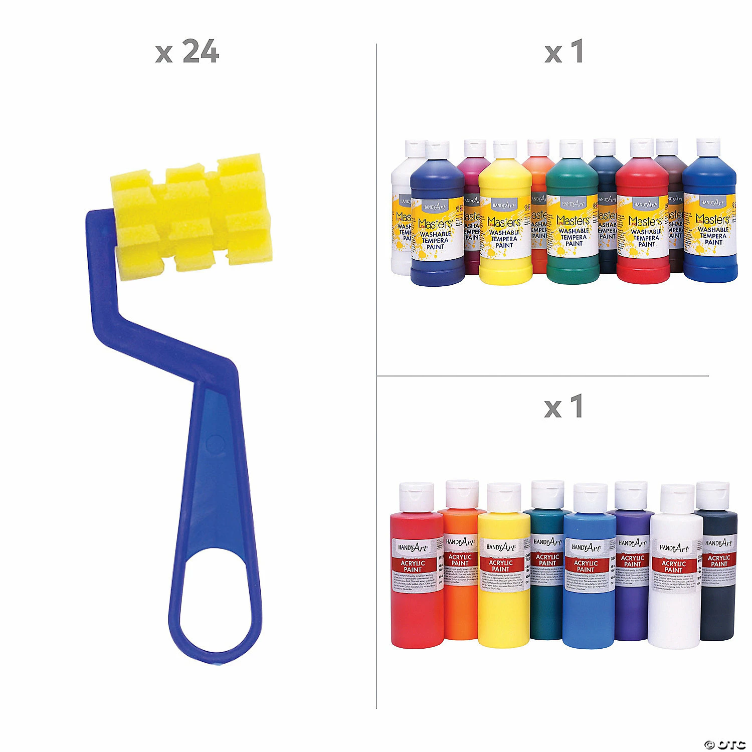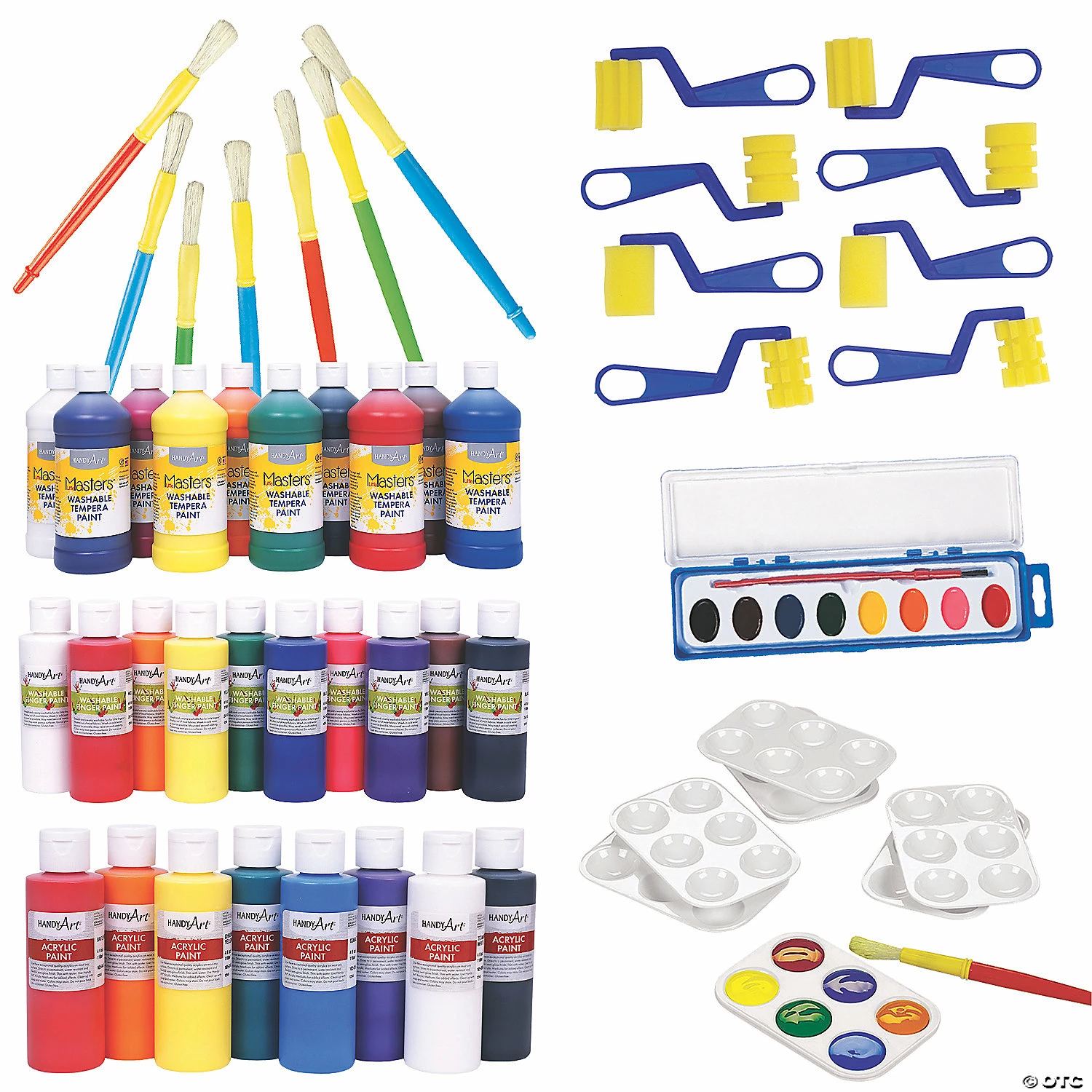 Unleash the inner artists in your students with this Ultimate Painting Kit. It doesn’t matter what type of painting kids want to do – acrylic, finger paints or even watercolors – this kit has them covered! Filled with a variety of paints, brushes and other painting supplies, this kit has everything needed to inspire some creativity in young artists. (124 pcs. per unit) Assortment may vary.Includes:• 8-Color Acrylic Paint Set (4 oz. each. Safe and non-toxic. Conforms to ASTM D-4236.)• 24 Plastic Chubby Paintbrushes (7″)• 10-Color Washable Finger Paint Set (4 oz. each. Safe, non-toxic and washable. Conforms to ASTM D-4236.)• 24 Foam with Plastic Handle Paint Textures Skinny Rollers (2 1/2″ x 6″)• 24 Plastic Rectangular Paint Palettes (5 1/4″ x 3 3/4″)• 10-Color Washable Classic Tempera Paint Set (8″ bottles, 16 oz. each. Safe and non-toxic. Conforms to ASTM D-4236.)• 24 8-Color Watercolor Paint Trays (8 1/4″ x 2 1/4″)