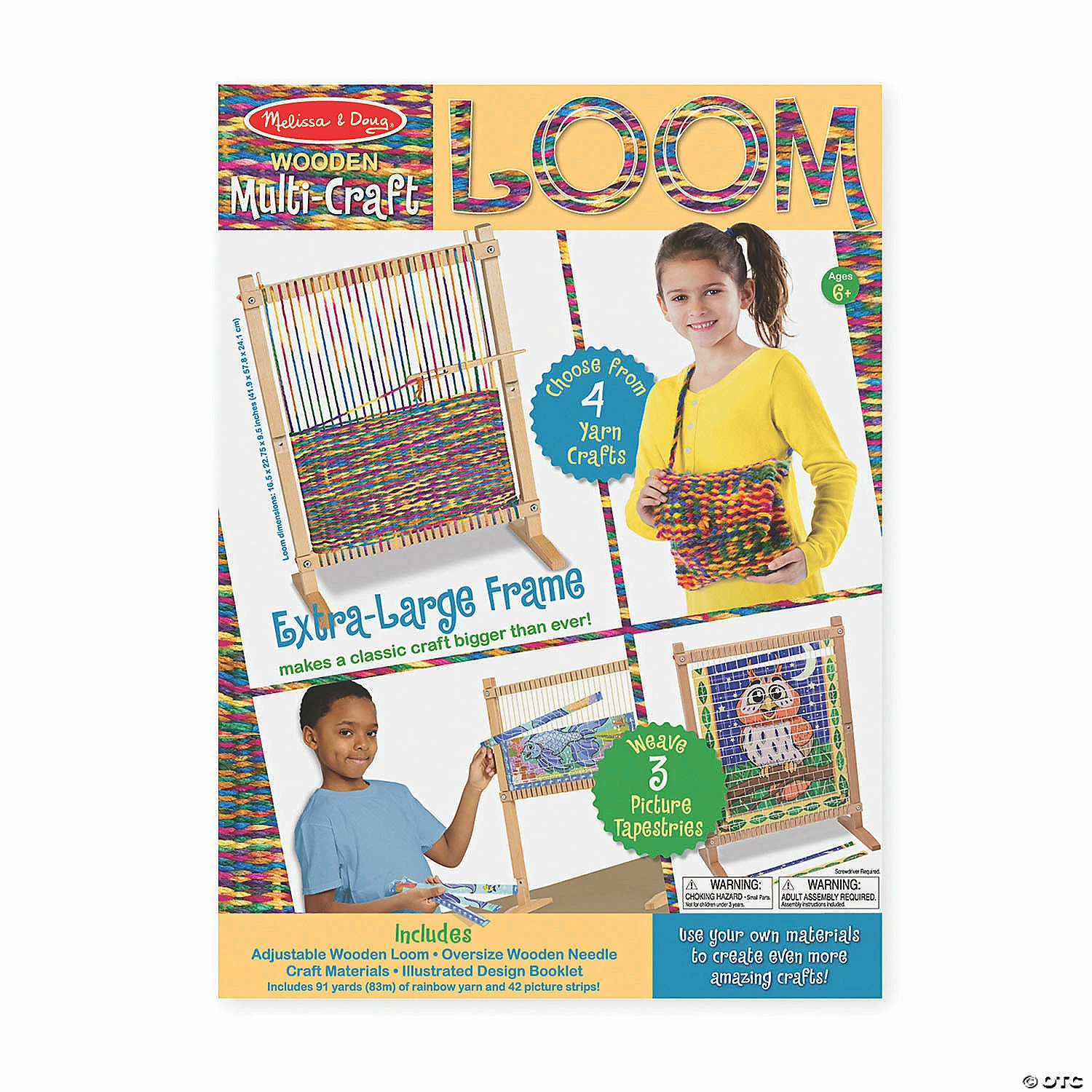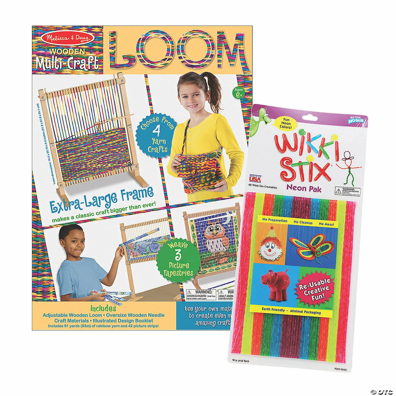 Each kit includes the following items:Melissa & Doug Multi-Craft Weaving LoomYoungsters will be thrilled to get creating with this Multi-Craft Weaving Loom. With its easy-to-use adjustable frame, oversize wooden needle, and generous 91 yards of rainbow yarn, kids can choose to make a scarf, a tasseled coaster, a drawstring pouch, a crafty carry-all-or whatever they design themselves! Great for all skill levels, this Loom also includes three picture tapestries to weave. Includes adjustable wooden loom, oversize wooden needle, craft materials, illustrated design booklet, 91 yards (83 m) of rainbow yarn, and 42 picture strips.Wikki Stix Wax Sticks, Neon Colors, Pack of 48Perfect for home and ideal for last-minute class projects. Wikki Stix are the timeless toy for hands-on fun and traditional play… plus perfect for educational activities and class projects. More fun than a toy… more creative than a craft! Widely used in schools, Wikki Stix conform to ASTM D-4236, and all CPSIA safety regulations. Recommended for ages 3 and up. This no-frills package offers lots of Wikki Stix creativity! Wikki Stix measure 8″ long. Shape, stick, play and learn! Colors include: Hot pink, Brite Yellow, Tangerine orange, Lime Green, Electric Blue and Bright Purple. Includes 48 Wikki Stix in primary colors and illustrations, play and craft ideas on the back.Special Shipping Information: This item ships separately from other items in your order. This item cannot ship to a P.O. Box. This item may be subject to additional processing days. ITEM IS NOT ELIGIBLE FOR EXPEDITED SHIPPING